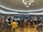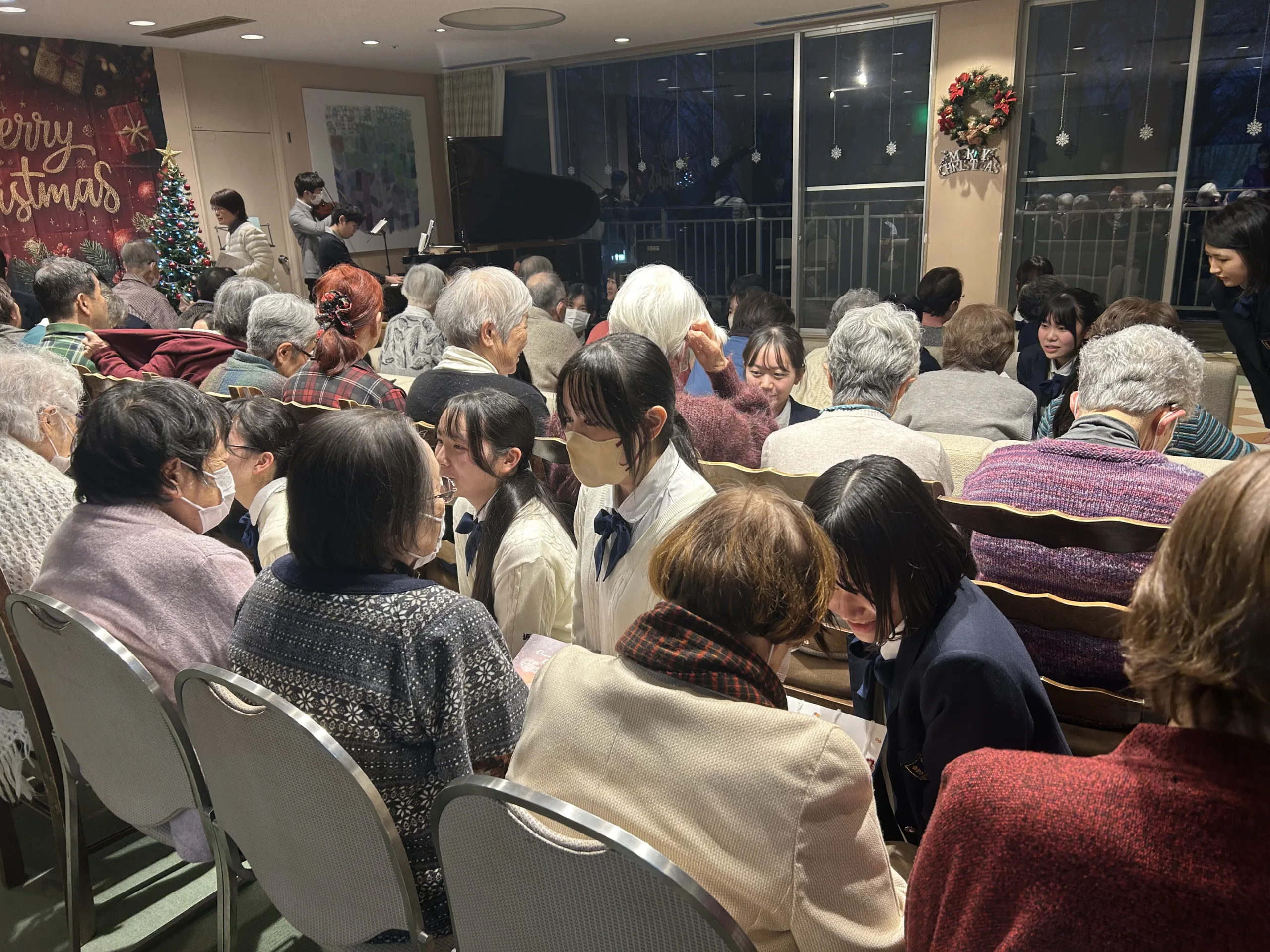 夜のキャロリングでは、2グループに分かれてクリスマスキャロルを歌いながら小さな灯りとプレゼントを手に居室の前を訪問して歩きました。面会で訪れたご家族と共に待っていて下さった方。歌を口ずさみながら居室から出て来て下さった方もいらっしゃいました。