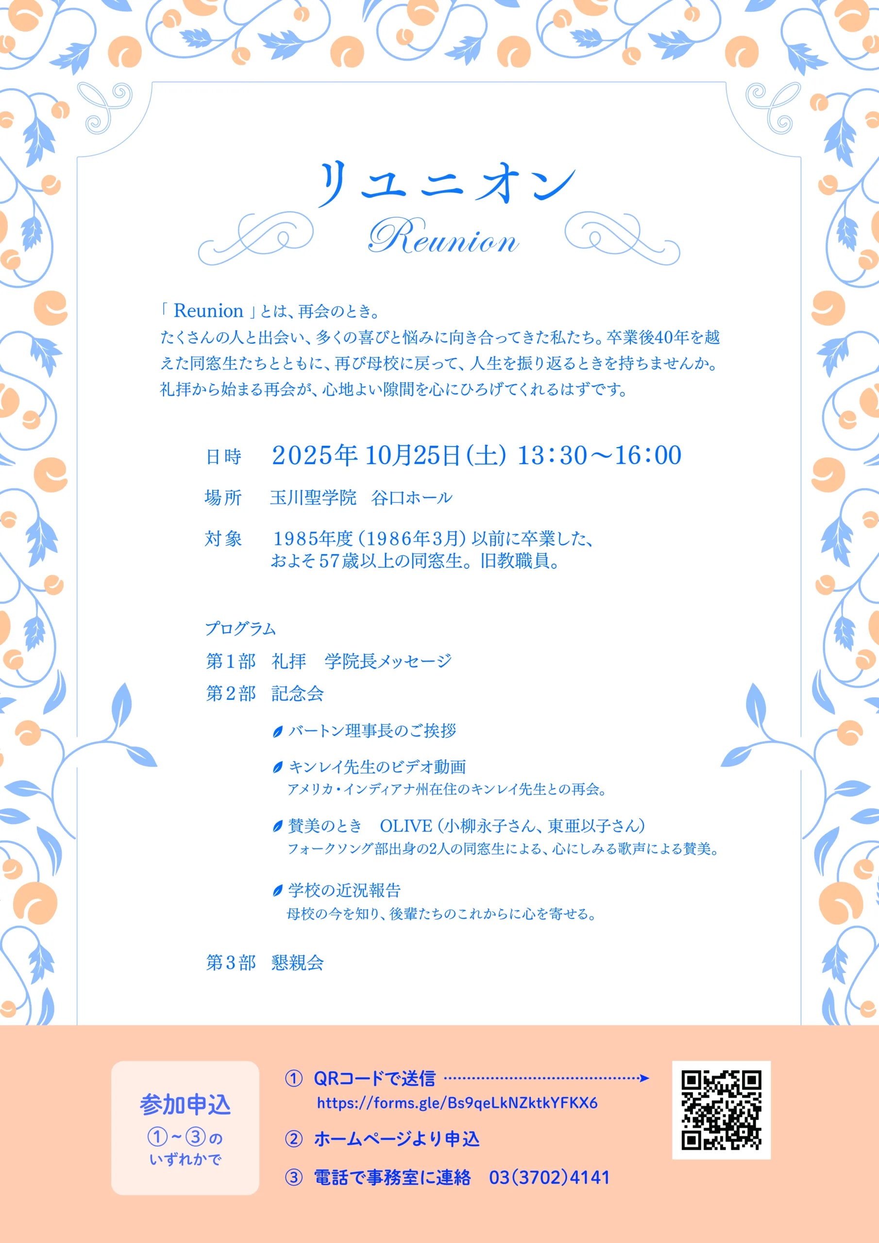 卒業後40年を越えた同窓生の皆さんの、仲間と再会し、人生を振り返るための集会「リユニオン」を今年も本校谷口ホールで開催します。